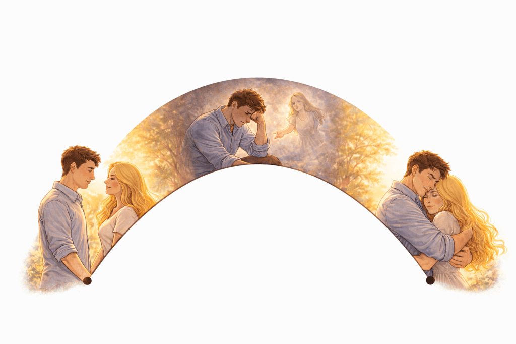 There is a formula followed in most, if not all, romantic movies, and in it’s simplist form it goes like this: love, crisis, and return, and with some drama in between. That’s the story arc. Typically, the crisis is around two-thirds or three-quarters of the way into the movie.